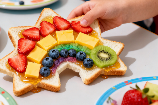Lepas Subuh tadi, rumah jadi macam makmal kecil. Syabil bangun dengan idea pelik tapi comel: nak buat roti pelangi. Roti putih disapu madu, ditambah strawberi merah dan keju kuning, lepas tu dipotong bentuk bintang dengan acuan mainan. Syarif pun sibuk nak join, tekan buah dengan jari kecilnya sambil ketawa bila madu meleleh.